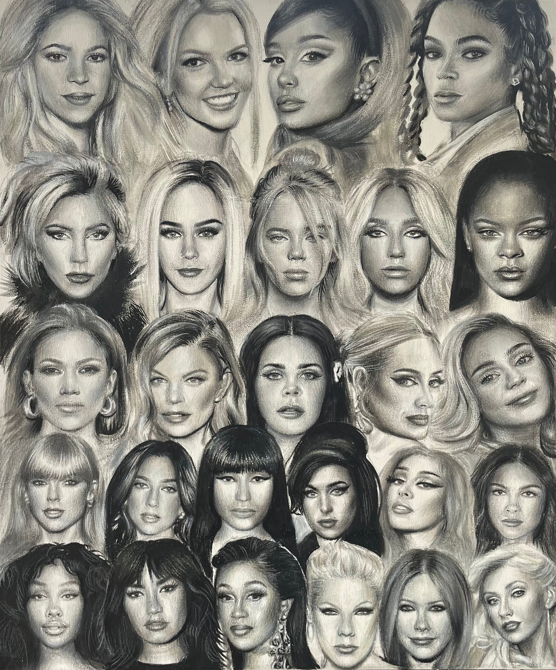 A2 Black and White Acrylic Collage Painting of iconic female music artists